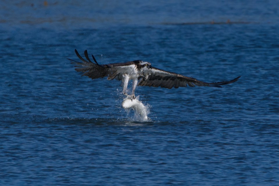For this osprey, it was pure instinct to catch whatever he saw as a “safe size.” It makes sense that if the fish was too large, the raptor would leave it alone. As it was, he dove and clenched his prey. After several tries, he realized he could not exit the water with this sized fish still flailing underneath. Some fifteen seconds later, after disabling the mullet, he ascended.