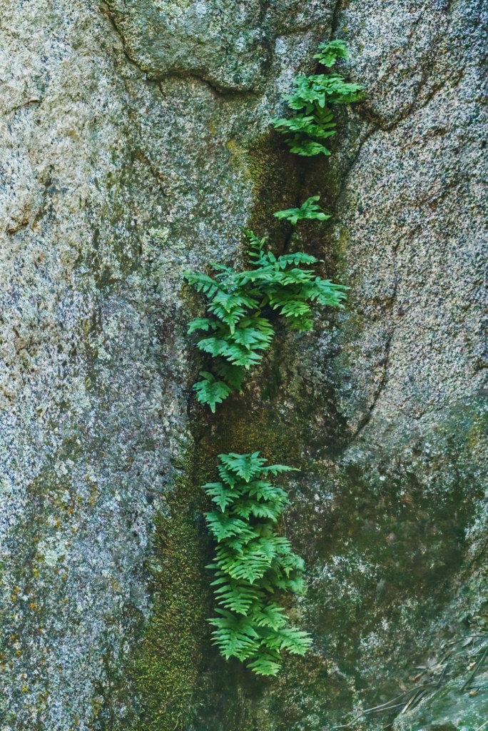 Along the way, we found an outcropping of north facing granite, with ferns growing out of them. Immediately I started channeling Alex Kunz and his mastery of isolating life overcoming adversity. Plants that pop out of the most unlikely places are not only intriguing but encouraging to the soul.