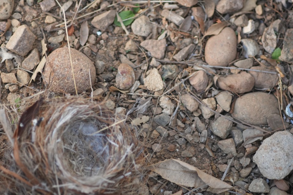 The next day, the nest was on the ground and the eggs eaten (partial shell in the photo).