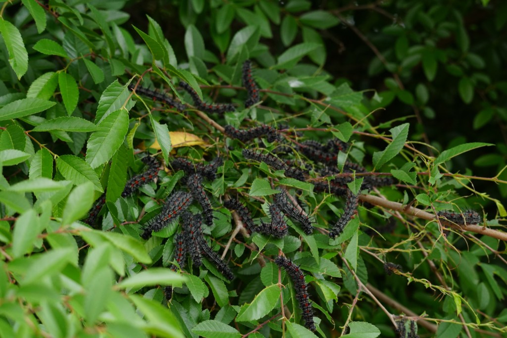 Earlier this spring as I was tending to our landscape irrigation, I noticed some little black dots on the ground under the Chinese elm. Looking up, there to my delight were dozens and dozens of caterpillars grazing on the leaves.